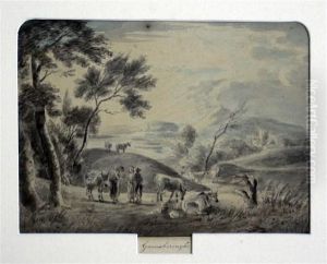 A Wooded Landscape With Herdsmen, Cows And Sheep Near A Pool,figures Outside A Cottage Beyond