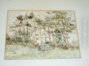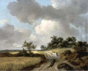 A Wooded Landscape With A Horse And Cart On A Country Path, Acottage Beyond