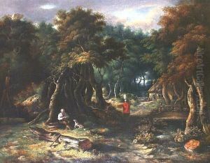 Wooded Landscape With Figures Outside A Cottage With Donkeys