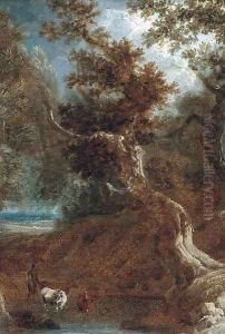 A Wooded Landscape With A Boy Watering A Grey Pony
