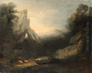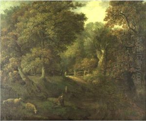 A Wooded Landscape With Herdsmen, Cows And Sheep Near A Pool,figures Outside A Cottage Beyond