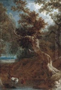 Wooded Landscape With A Herdsman Driving Cattle Towards A Pool