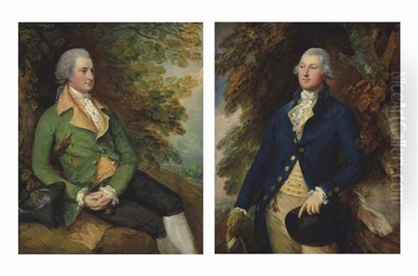 Portrait Of Thomas Brooke (?1755-1820), Three-quarter-length, In A Green Frock Coat, Resting By A Tree In Wooded Landscape; And Portrait Of Sir Richard Brooke, 5th Bt. (1753-1795), Three-quarter-length, In A Yellow Striped Waistcoat And Blue Frock Coat, I