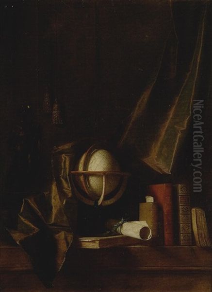 Nature Morte A La Statuette De Bronze, Sphere Et Livres Devant Un Rideau