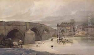 Wetherby Bridge, Yorkshire, looking through the bridge to the mills