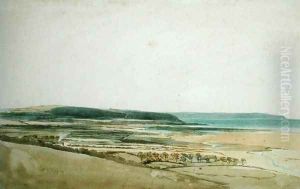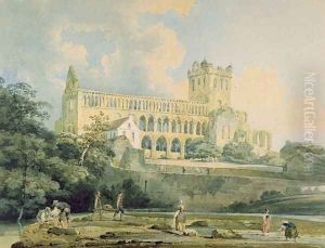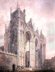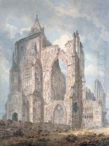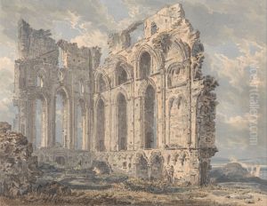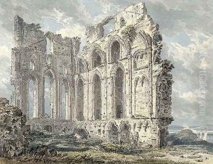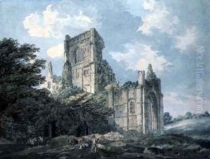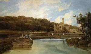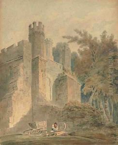 Okehampton Castle, Devon, with cattle and a herdsman in the foreground