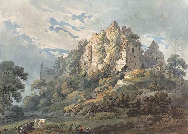 Okehampton Castle, Devon, with cattle and a herdsman in the foreground