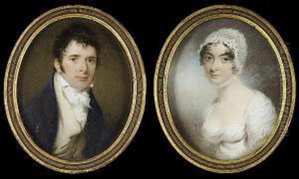 A Pair Of Portraits Of A Lady And Gentleman, Probably Of The Leigh Family: She, Wearing White Dress And Lace Bonnet Adorned With White Flower Tied Beneath Her Chin; He, Wearing Blue Coat, Cream Waistcoat, Tied White Stock And Frilled Cravat