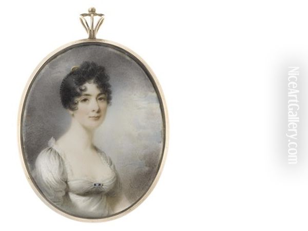 Mrs Mary Gaskell (d.1845), Wearing White Dress Edged With Lace, Sapphire Brooch At Her Corsage, Her Raven Hair Braided, Curled And Upswept With A Tortoiseshell Comb