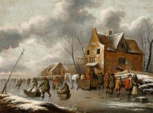 A Winter Landscape With Villagers On A Frozen Lake Outside A Town