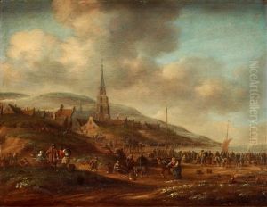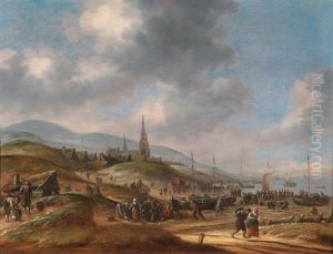 Eine Belebte Strandlandschaft Bei Scheveningen Mit Landenden Schiffen, Im Hintergrund Eine Kirche