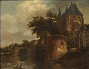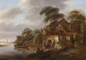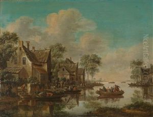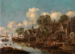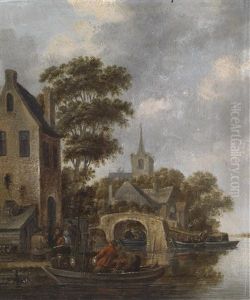 A River Landscape Beside A Village With Figures Loading Their Boats