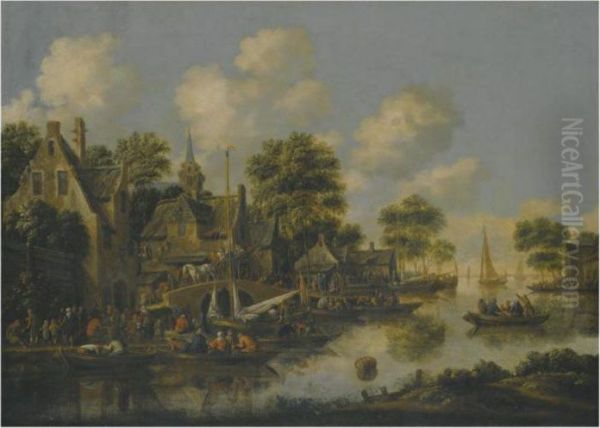 A River Landscape With Figures Unloading Their Boats Beside A Busy Village