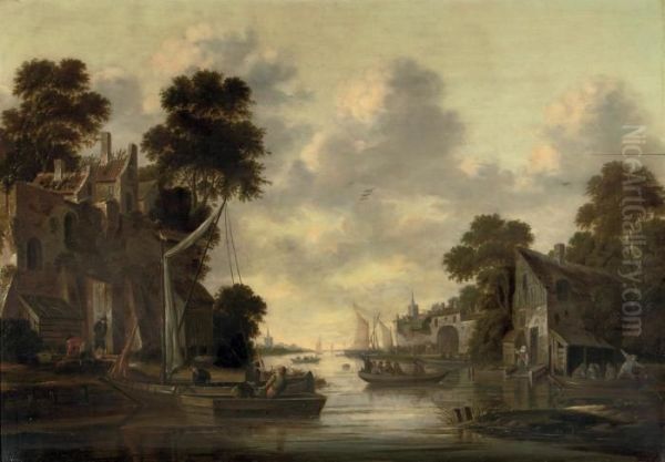 A River Landscape With Fishermen And Their Boats By A Village