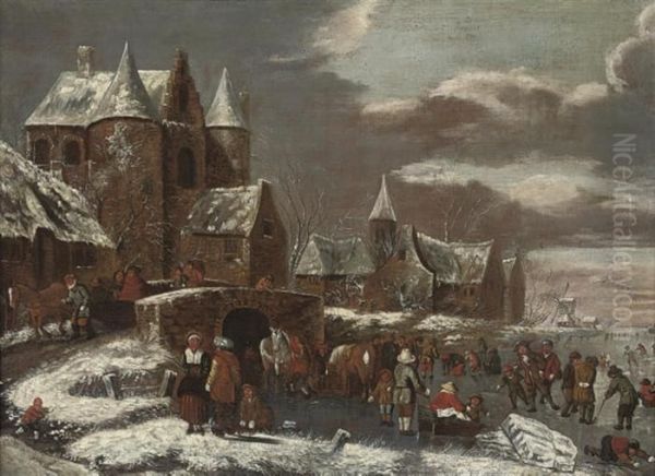 A Winter Landscape With Figures On A Frozen River Before Atown