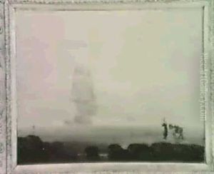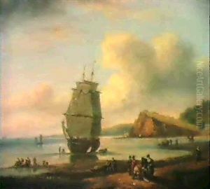 Figures Hauling In A Skiff, A Cutter And Frigate Beyond, At Dusk