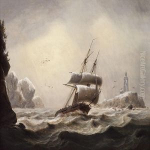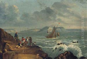 Small Craft Heading Inshore Ahead Of A Squall,with A Frigate Anchoring For Shelter Beyond