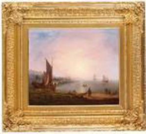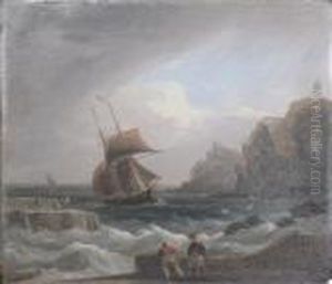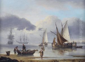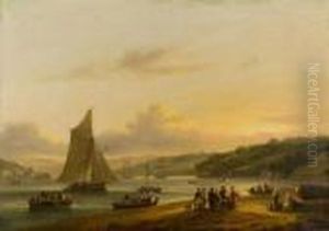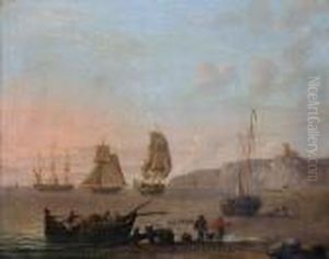 A 26-gun Frigate Of The Royal Navy Off A Headland; Fishermen In Anestuary