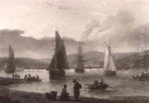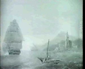 Figures Hauling In A Skiff, A Cutter And Frigate Beyond, At Dusk