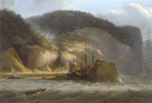 A Lugger, A Man O'war And Other Shipping Off A Rocky Coastline