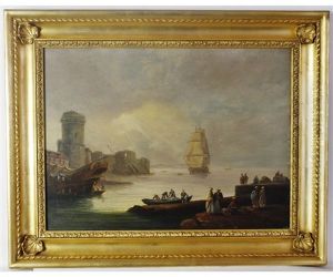 A Mediterranean Xebec Flying Messina Flags And Shortening Sail As She Approaches The Quayside At Her Home Port, With A View Of The Straits Of Messina Beyond
