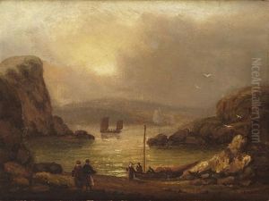 Fishing Boats And Figures In A Rowing Boat In Choppy Seas By A Rocky Coast