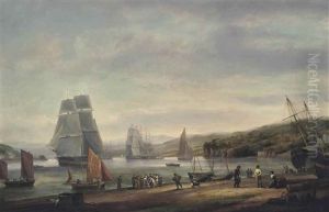 An East Indiamen Lying At Anchor Off The Island Of St. Helena With Other East Indiamen Getting Underway