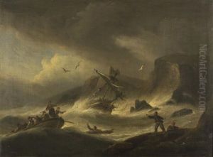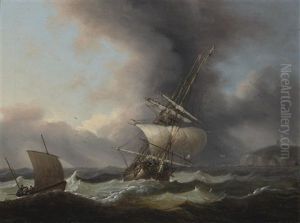 Fishermen Reefing-down In An Approaching Storm, With A Dutch Warship Beyond