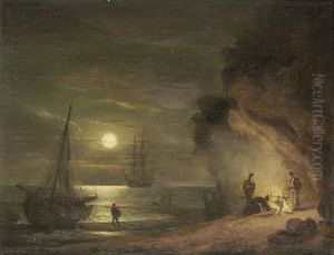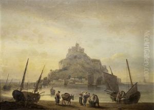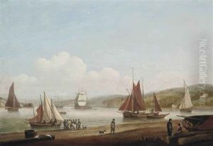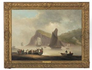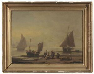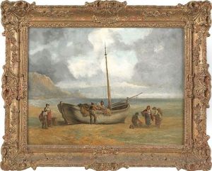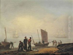 Fishermen Unloading Their Catch On A Shore, Men-of-war Beyond
