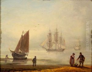 An Estuary Scene With Fishermen Unloading The Boats In A Calm, A Schooner In The Background
