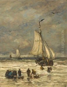 Fisher Folk Unloading The Catch With Sailing Boats Heading Out To Sea