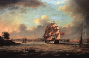 A 70 Gun Ship In Barn Pool Off Plymouth Sound With Mount Edgecumbe Beyond