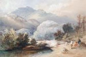 Figures On A Bridge, Mountains Beyond