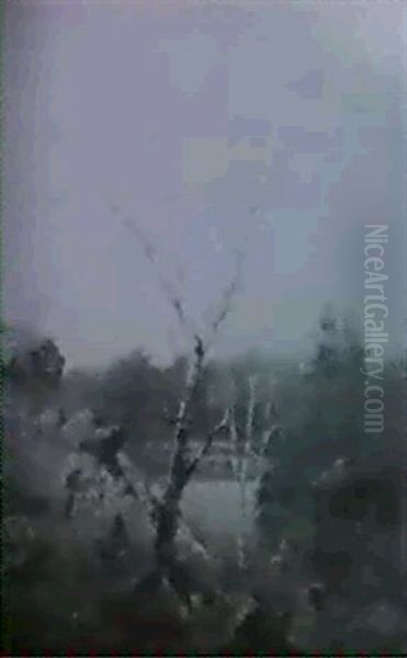 Birches By A River Shore &d: On Panel] & Wild Flowers Amidst Tree Stumps