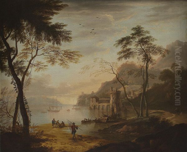 An Italianate Coastal View With Fishermen Unloading Their Catch