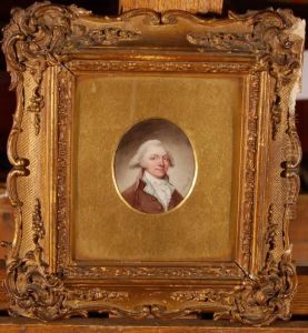 A Lady, Wearing Blue Dress, White Fichu, Lace Underslip And Veil In Her Powdered Hair.