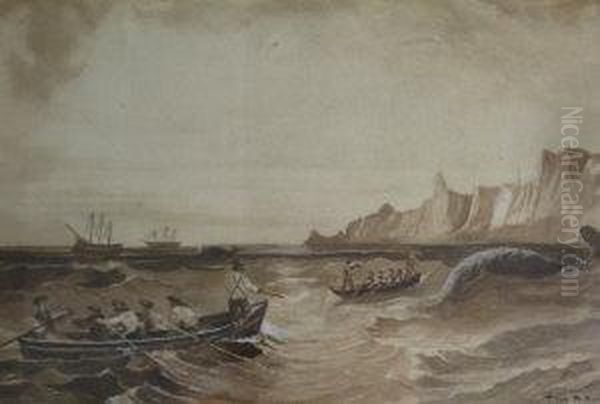 P Evans, Monochromewatercolour, Seascape With Figures In Row Boats, 7ins X 10ins