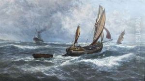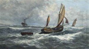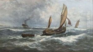 Sailing Boats And Steamer Off The Coast At Whitby, Yorkshire.