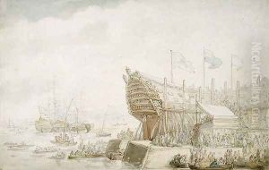 The Launching of H.M.S. Hibernia at Devonport, c.1804