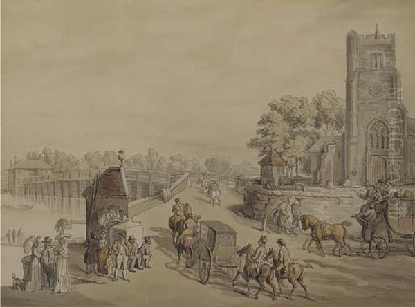 Bustling Activity Before St. Mary's Church With Putney Bridge Beyond