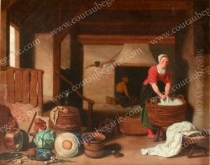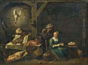 Kucheninterieur. Familie In Der Stube Neben Zahlreichen Topfen, Krugen Und Gemuse