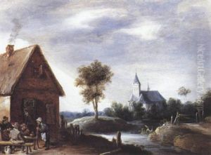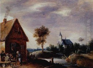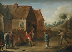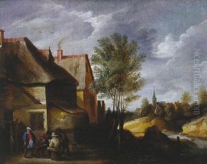 A Busy Village Scene With Carousing Figures And Distant Windmill