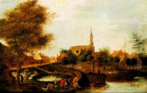 Peasants Bathing By A Village