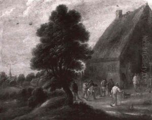 Boors Playing At Skittle On A Yard, A Village Beyond