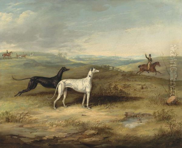 Hare Coursing - Two Greyhounds With A Distant Rider
