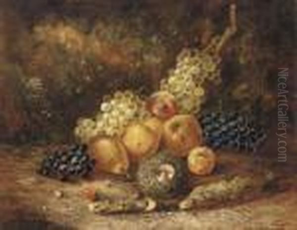 Grapes, Pears, Apples, A Peach And A Bird's Nest With Eggs, On A Mossy Bank