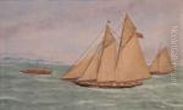 Fishing Schooner With Two Yachts With Lighthouse In Thedistance