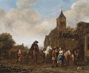 A Busy Village Scene With Carousing Figures And Distant Windmill