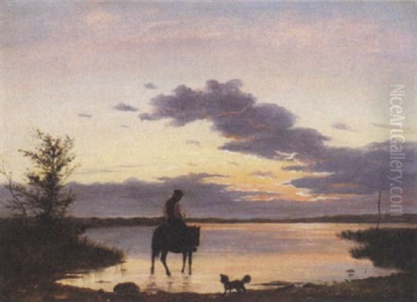 Aftenrode Ved Maribo So, Pa Bredden Rytter Og Lille Hund