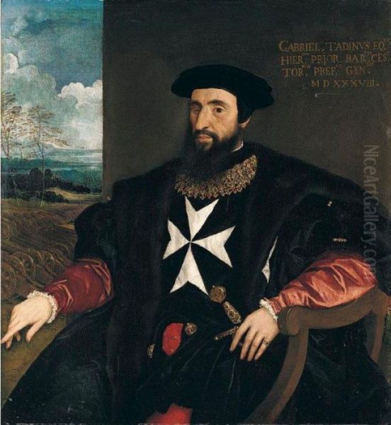 Portrait Of Gabriele Tadino (1480-1544), Three-quarter Length Seated, Wearing The Robes Of The Order Of The Knights Of Malta, A Landscape With Cannons Beyond